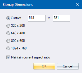 Select the size (in pixels) of the bitmap to be created. The Custom option automatically defaults to the current size of the view. |