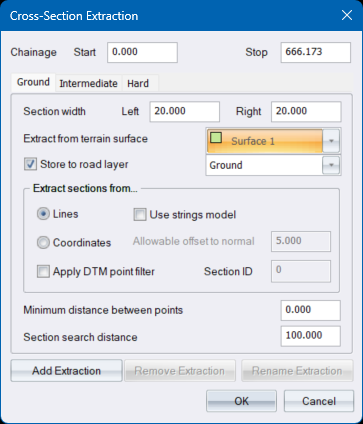 Specify the parameters to extract cross-sections from the terrain model. Select the “Intermediate” or “Hard” tabs to specify the extraction settings for cross sections that can be used for the calculation of extra-over excavation quantities ( Volume Calculations ). These cross sections will be extracted simultaneously..