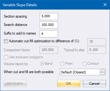 Enter the depth of topsoil to be stripped from the terrace before fill takes place. Note that this entry is not used during the balancing calculations but is used when the final volumes are reported. |