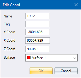 This function allows you to graphically edit points in the database with a mouse. The name and coordinates of the nearest point to the cursor when the mouse is clicked is displayed. Any of the fields (Name, Y, X, Z or Surface) can be altered.