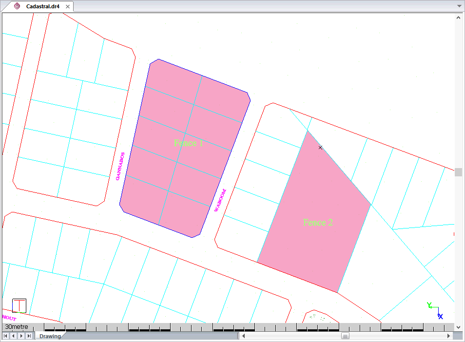 This function allows you to graphically display all the fences that have been defined in this project. Each fence is shown by displaying a solid hatch with the fence name in the centre.