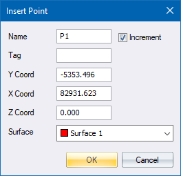 This function allows you to insert points into the database graphically with the mouse. When the mouse is clicked, the point details display with the coordinates. Switching on Snap Mode allows you to snap to the nearest existing point. A name can be entered and a surface to which the point should be assigned must be selected. The Y, X or Z coordinates can be altered if required.