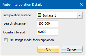 This function allows you to toggle auto interpolation on or off. When auto interpolation is toggled on, you are asked to select an interpolation surface, which must have a line structure, and a search radius. Then, when a point is indicated in a function such as Insert Point, the Z ordinate of the point's coordinates is interpolated from the line structure of the selected surface.