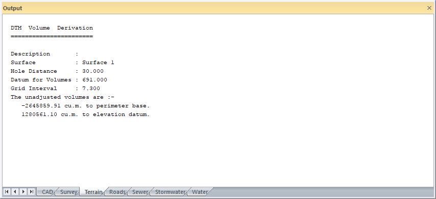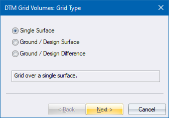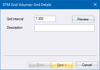 A grid interval must be defined. This interval controls a trade off between speed and precision. The site is broken up into squares called sheets. These sheets can be viewed by selecting Preview inside the dialog box. Each sheet comprises of 40 x 40 grid points at the specified spacing. A maximum of 200 sheets is permissible. If this number is exceeded, larger grid spacing must be specified. A smaller grid interval produces more sheets, and thus a more concentrated grid, which yields a higher accuracy in the volumes and smoother contours, but takes longer to process.