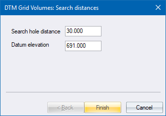 A 'Search hole' distance controls the way in which the data is interpreted. As each grid line is scanned, elevations are initially interpolated from the line data at the spots where the grid line crosses them. If the distance between these interpolations is greater than the specified 'Search hole' distance, no elevations will be generated at those locations and contours and volumes will not be obtained in this region. This setting can therefore be used to avoid contouring or quantifying through dams or large buildings, across the arms of horseshoe shaped sites, etc.
