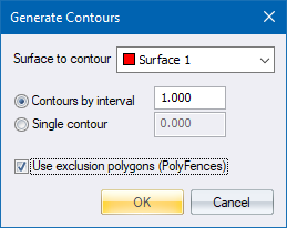 Areas within the site that you do not want contoured, e.g. buildings, water surface, etc, first need to be defined as polyfences. Then at the contour stage, select those polyfences as exclusion polygons and those areas won't be contoured. Keep the polyfences as simple as possible. For complex shapes, rather divide the area up into smaller simpler figures by adding additional break lines. Then define multiple smaller polyfences instead of one large one. At a later stage, after generating the contours, you can thrn remove these fictitious breaklines. In this way, you minimize the chance of getting unwanted parts of contours that erroneously cross the polyfence.