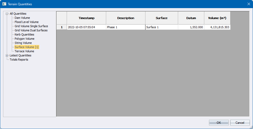 This function will allow you to see the results of earlier runs of the various Volume calculations. All Quantities gives you the historic listing of all calculations. Latest Quantities gives you the list of only the last calculation of any given description. Total Reports gives you a means to have a summation of columns of selected calculations. The information is stored with the terrain file so it is remembered between runs of the program.